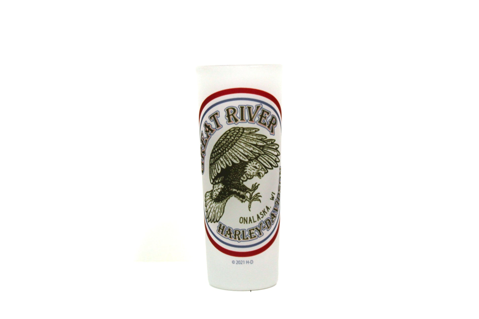 4oz Shot Glass with the classic Great River Harley-Davidson Red, White, and Blue Logo. Available in Clear or Frosted glass finish.